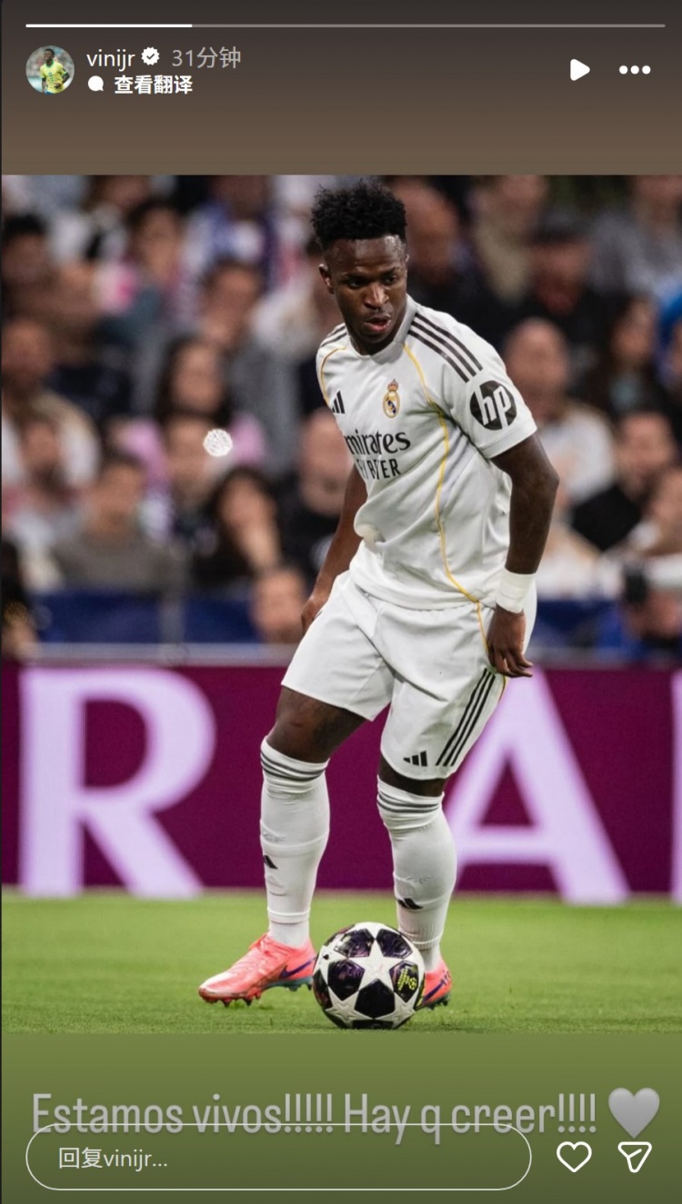 皇马前场球员维尼修斯社媒晒出赛事 照片,鼓励球队次局 反转 ,配文:“我们还活着!我们必须相信!”