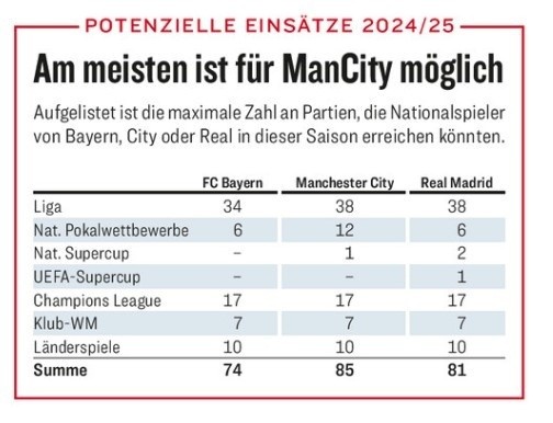 上赛季,曼城、皇马和拜仁都没有达到极致 场次,但超负荷运转已经成为了豪门的日常。