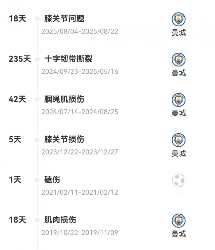 2024/25赛季初,罗德里遭遇膝盖前十字韧带撕裂(ACL)的重伤,休战235天。以金球先生的负伤 为转折点,曼城褪去了“七年六冠”时期的光环,提前进入了重建期。