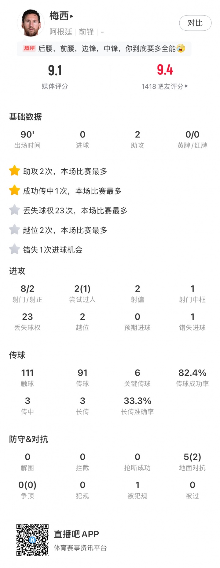 梅西全场数据: