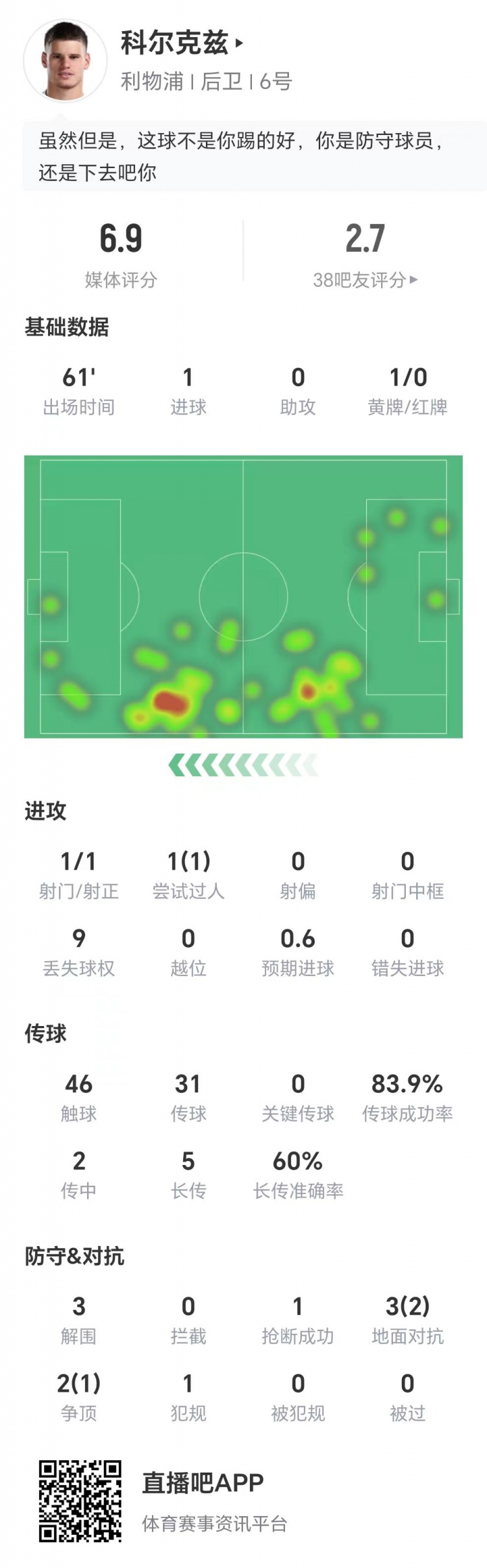 10月26日讯 英超第9轮赛事 ,利物浦在客场应战 应战 布伦特福德。本场赛事 ,科尔克兹为利物浦打进1球,他在赛事 第61分钟被换下。
