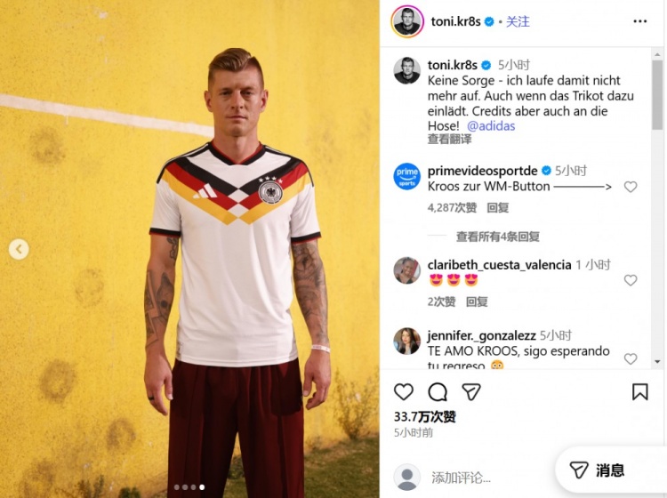 在社交媒体上,克罗斯晒出了自己身披德国2026年世界杯赛 运动活动 服 照片,并写道:不必担心,24直播网我再也不会穿着它快跑 了,尽管这件运动活动 服 确实很诱人。顺便说一句,这件球裤也不错。