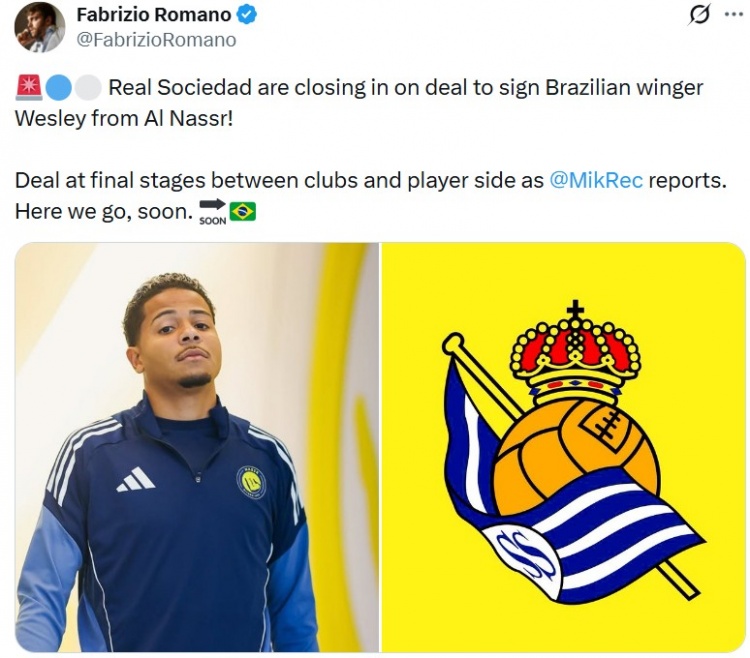 1月29日讯 据知名记者罗马诺报道,皇家社会接近签下巴西翼锋韦斯利。