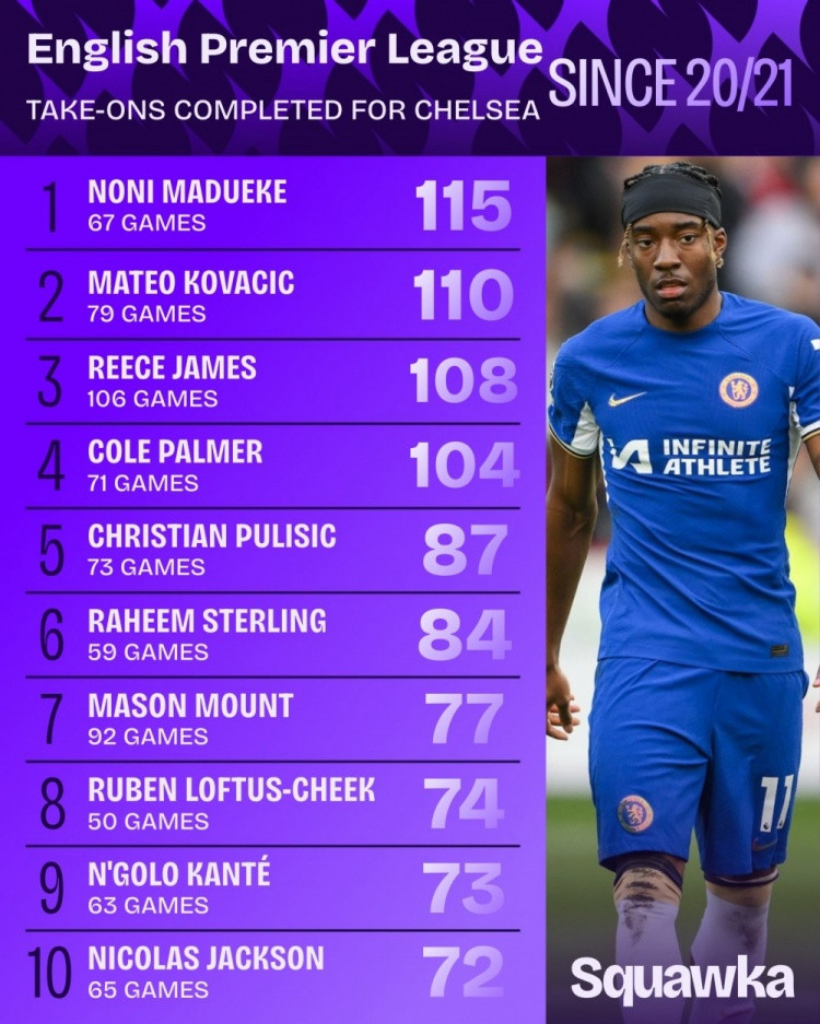 直播吧9月7日讯squakwa统计了20-21赛季以来的切尔西英超成功过人情况,马杜埃凯居首,24直播网仅3人仍在阵中。