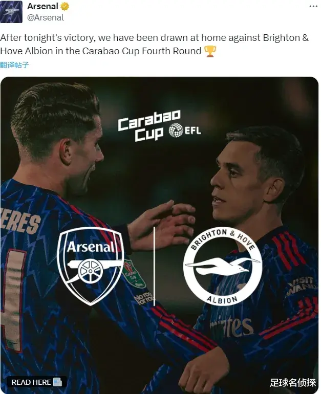 马官方:在击败韦尔港之后,阿森纳将在卡拉宝杯第四轮中主场作战 对阵布莱顿。
