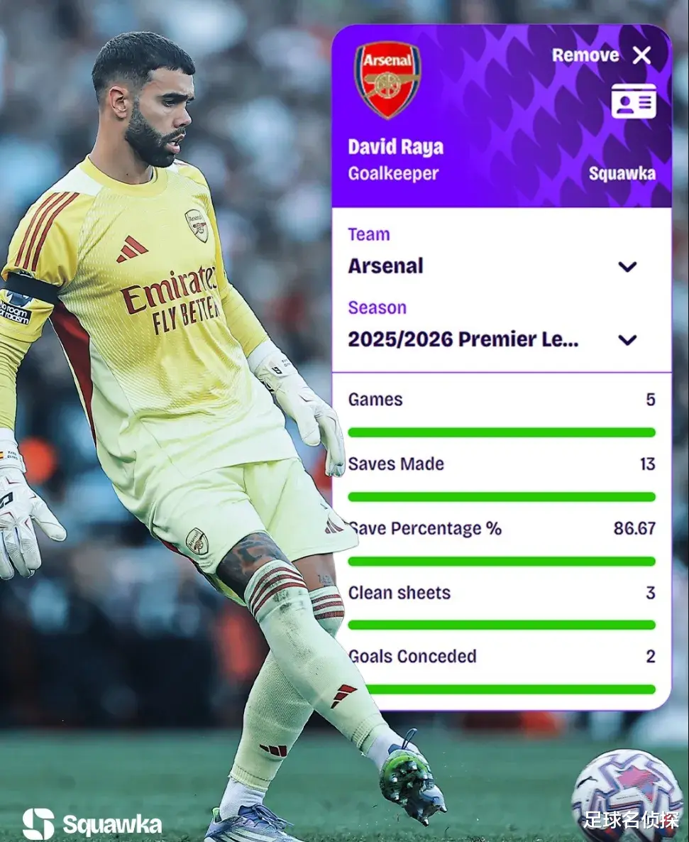 Squawka统计,拉亚是本赛季迄今为止英超抢救 成功率最高的守门员,86.67%。