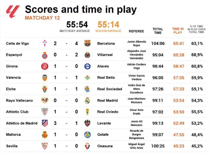 11月10日讯 数据网站OPTA盘点了本轮西甲有效时间榜单,其中巴萨4-2塞尔塔以及比利亚雷亚尔2-0西班牙人的两场赛事 有效时间超过65分钟。