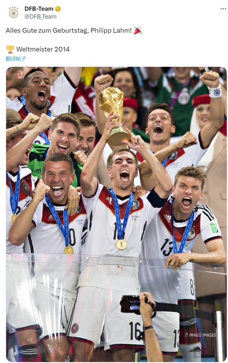 德国队社媒晒出拉姆捧起大力神杯的照片,配文:“祝2014年世界杯赛 第一名 拉姆生日快乐!”