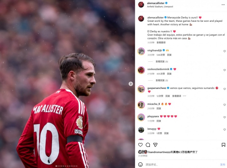 麦卡利斯特赛后在个人社媒晒出本场照片,配文写道:“默西塞德德比获胜 属于我们欧冠2025全场回放,球队拿出了很棒的表现,英超直播这是必须要取胜,必须全力奋斗 的赛事 ,又一场主场作战 获胜 !”