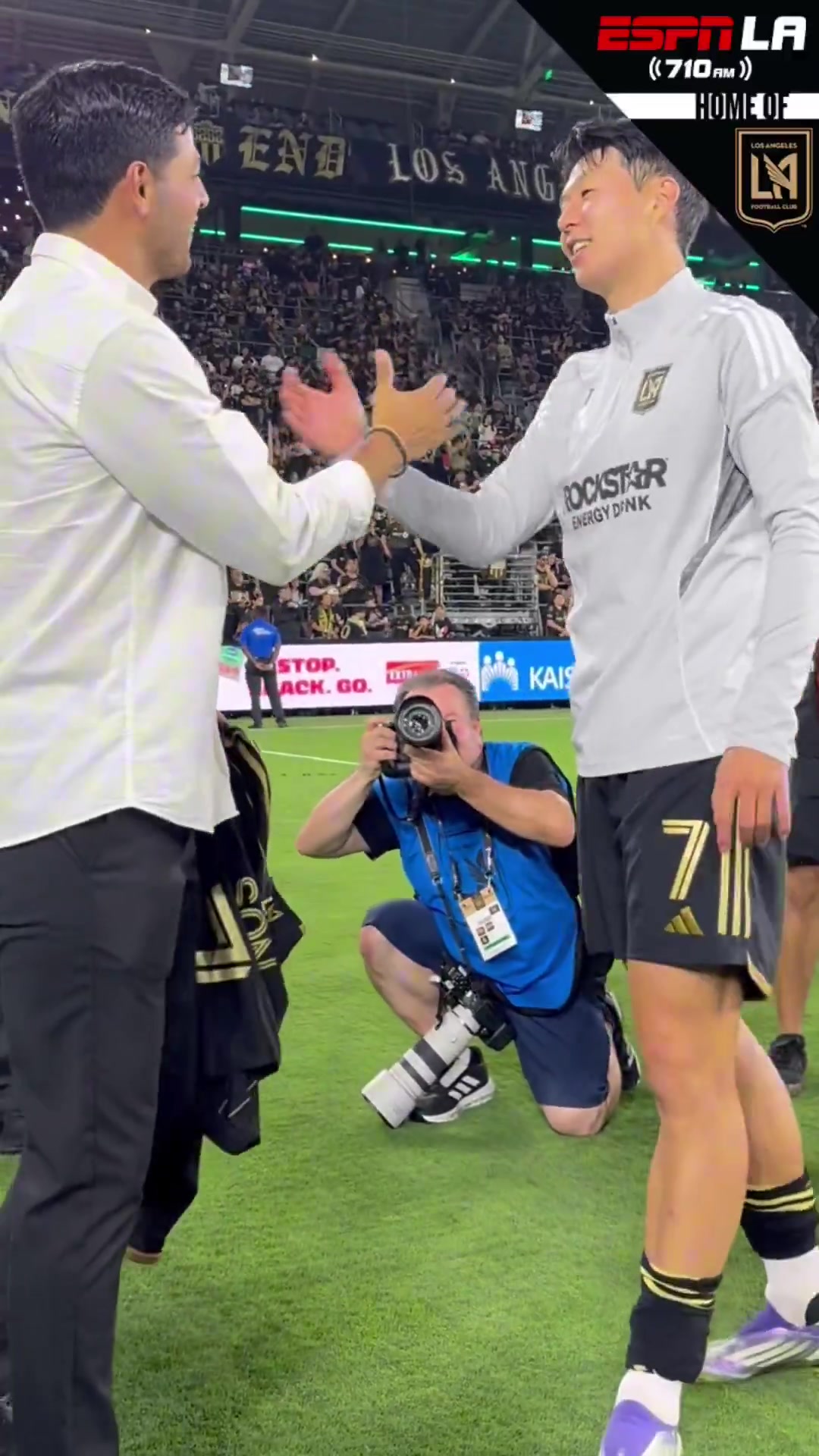 9月22日讯 今天早晨,洛杉矶4-1大胜皇家盐湖城,赛后孙兴慜与LAFC名宿卡洛斯-贝拉互动。