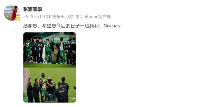 10月6日讯 昨晚,北京国安俱乐部官方宣布主帅塞蒂恩离任。国安球员张源更新个人微博,向塞蒂恩送上祝福。