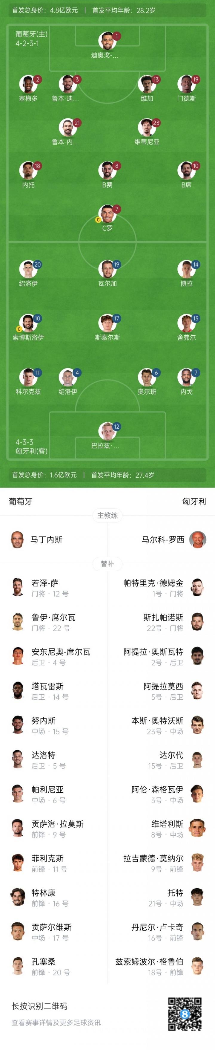 葡萄牙杆位:1-迪奥戈·科斯塔、2-塞梅多、3-鲁本·迪亚斯、13-维加、19-努诺·门德斯、8-B费、21-鲁本·内维斯、23-维蒂尼亚、10-B席、18-内托、7-C罗