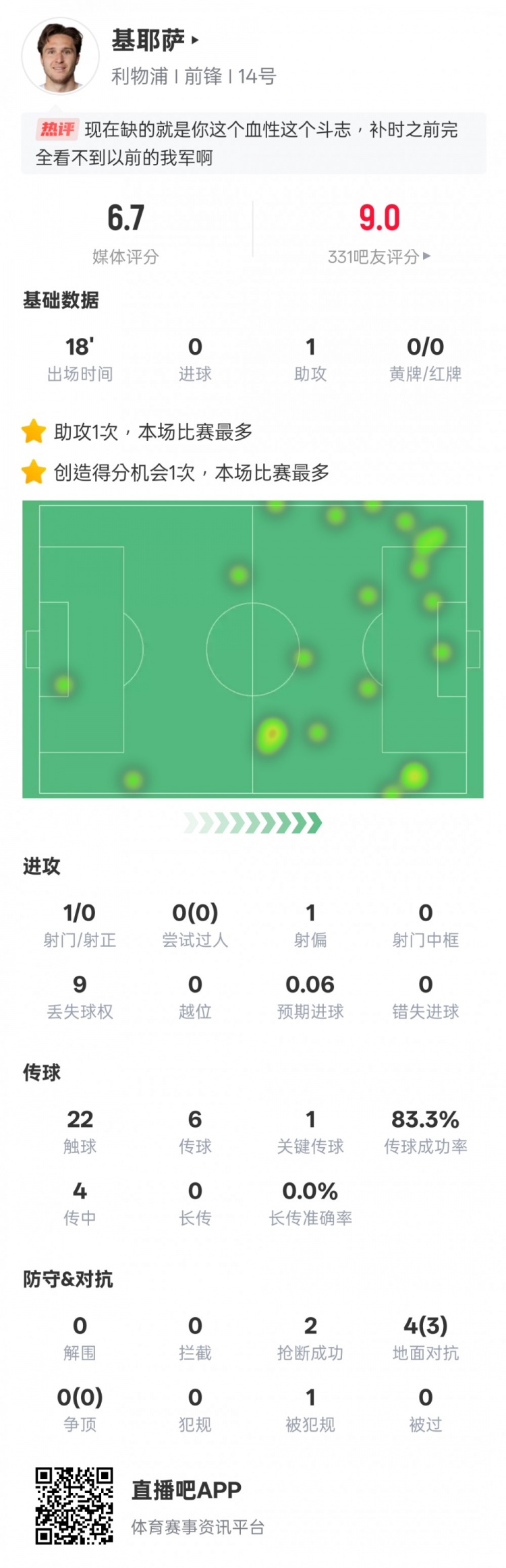 10月20日讯 2025-26赛季英超第8轮焦点战,利物浦主场作战 1-2曼联。小基耶萨后备 登场,送出1次助功 ,英超比赛在线观看无插件1次关键传送球 ,还有2次抄截 ,评分6.7。