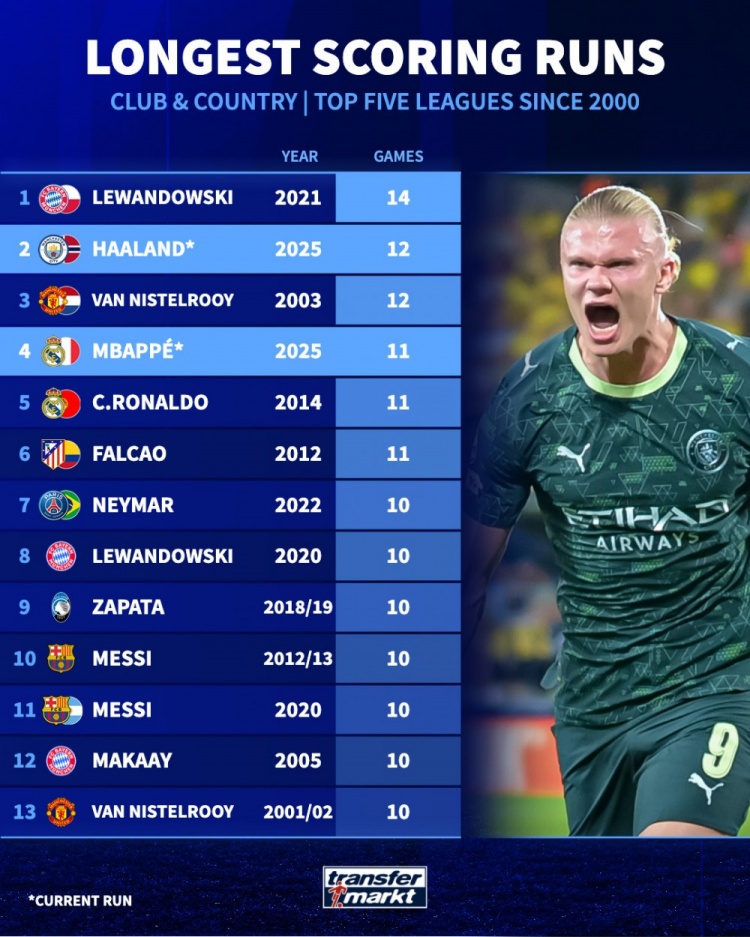 2.哈兰德,2025年,连续12场得分 (当前记录 )